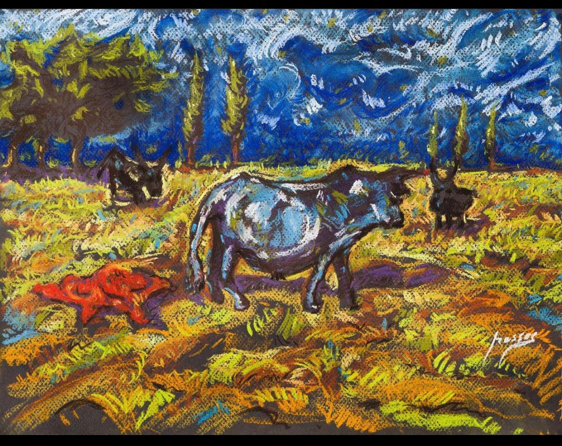 El uso del pastel, una técnica que ofrece un acabado texturizado y suave, permite que los trazos del artista se sientan casi palpables. Las líneas ondulantes y los colores que parecen fusionarse con la luz y el movimiento del entorno son características típicas del impresionismo, pero la decisión de emplear un toro azul como figura central le otorga un simbolismo que trasciende lo representativo. El toro azul puede ser interpretado como una figura de poder y misterio, dado su color poco convencional, para un animal que suele asociarse con la fuerza.